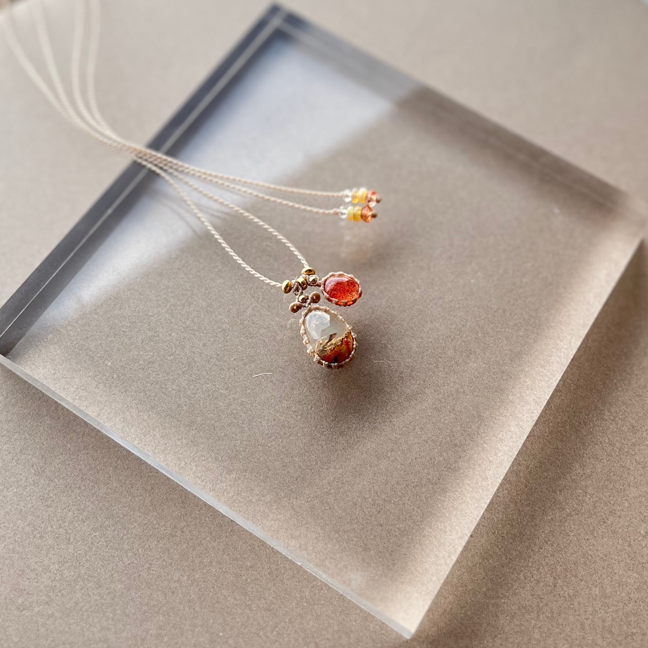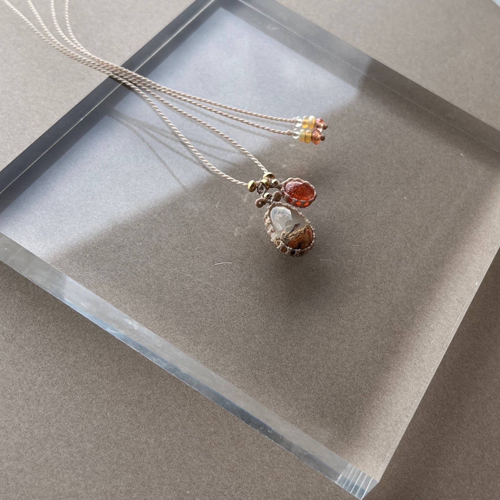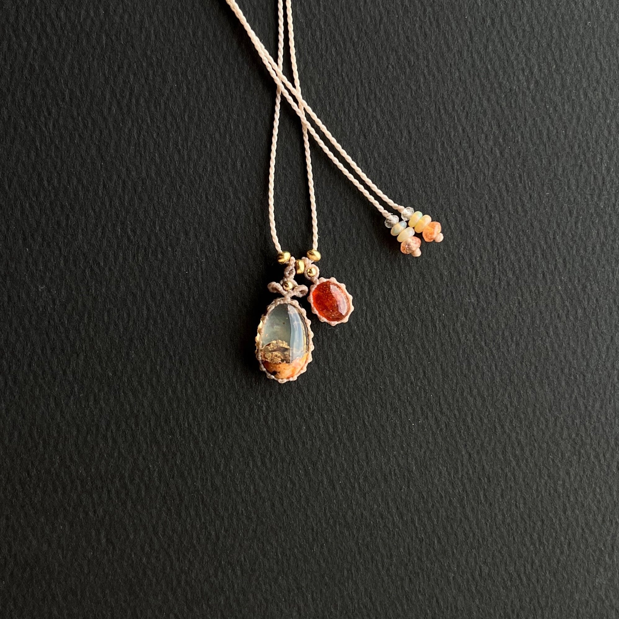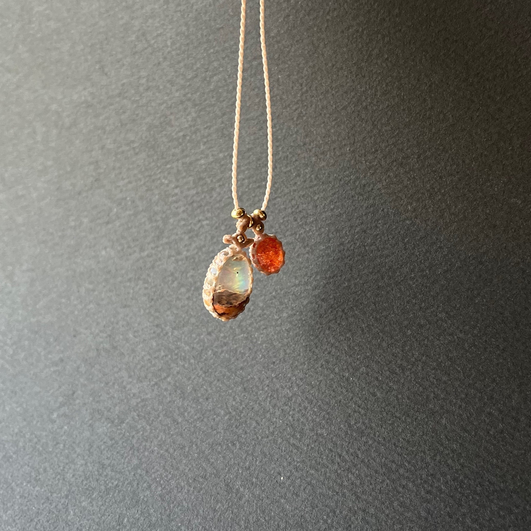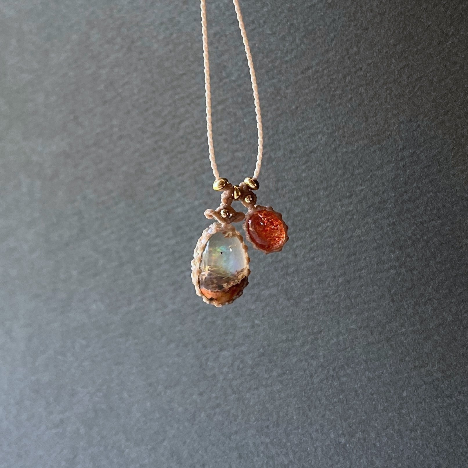 カンテラオパールとサンストーンのマクラメ編み 天然石ネックレス