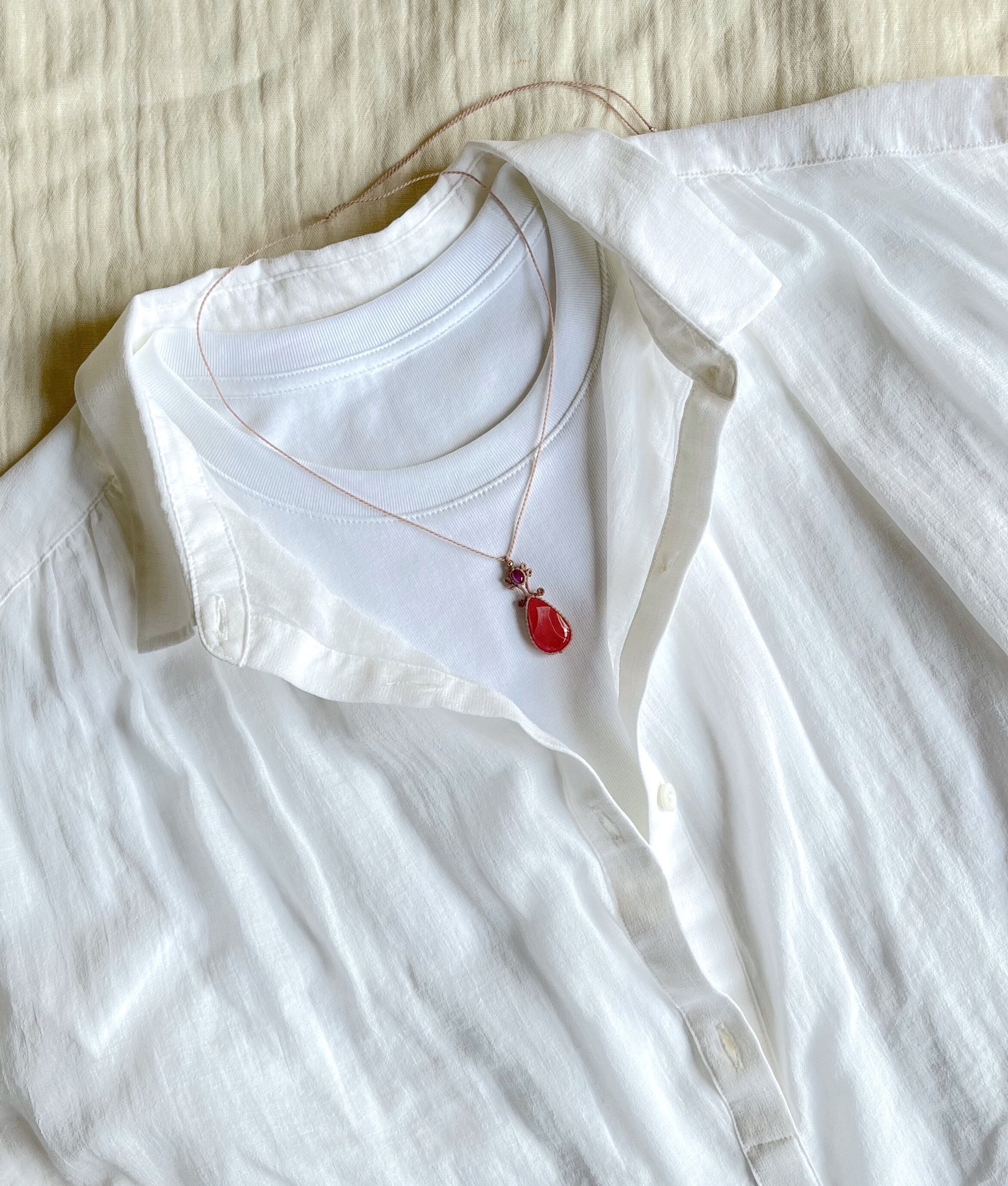 その名の通り生命力・情熱・実りを象徴する、歴史上最も古い宝石のひとつで、魔よけのお守りとして大切にされていました。古代ギリシャやローマでは、「血」を連想させるその色あいから、怪我を防ぐ護符として兵士達が身に着けていたそうです。