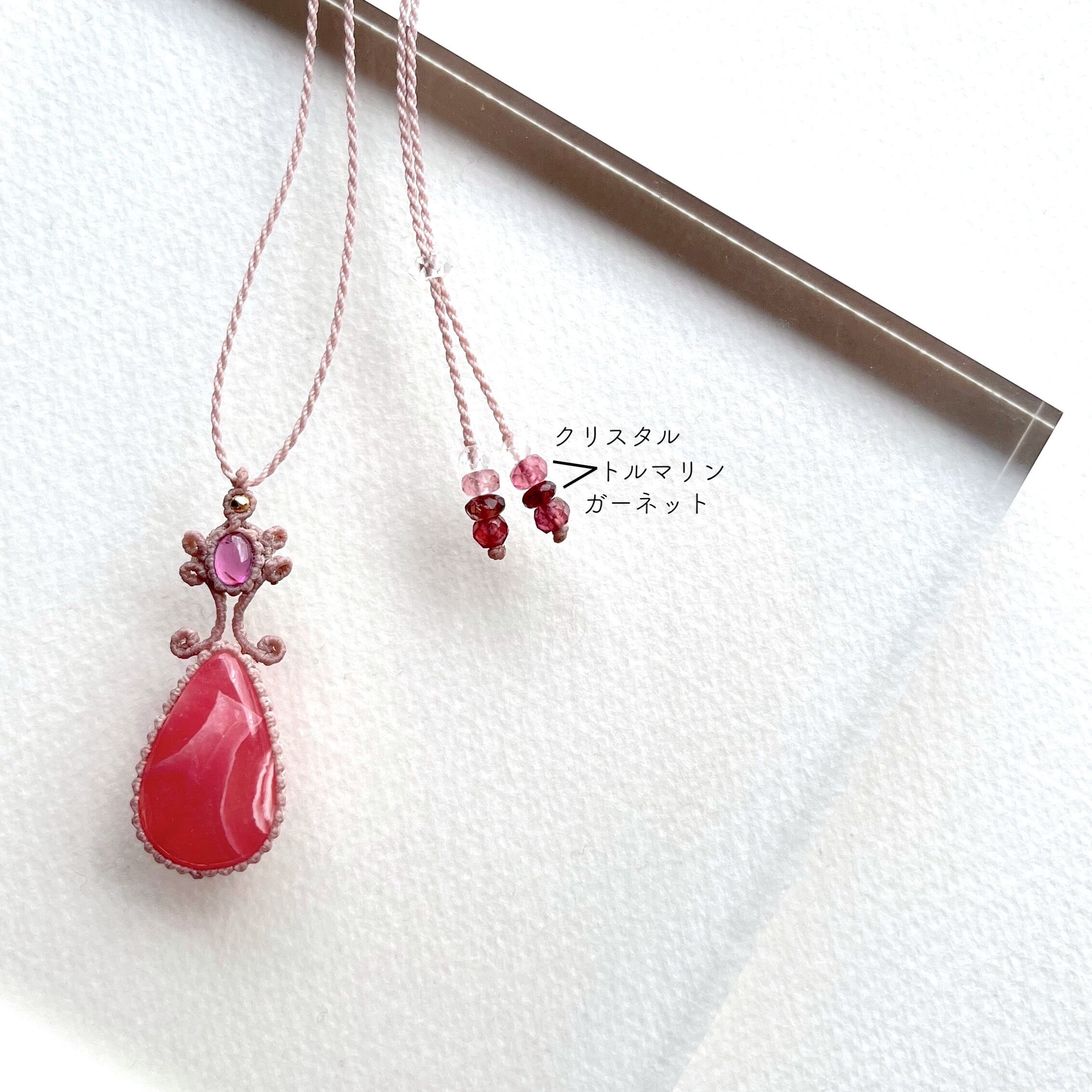 ペルー産インカローズとモザンビーク産ガーネットを使用したマクラメ編み ハンドメイドネックレスです。