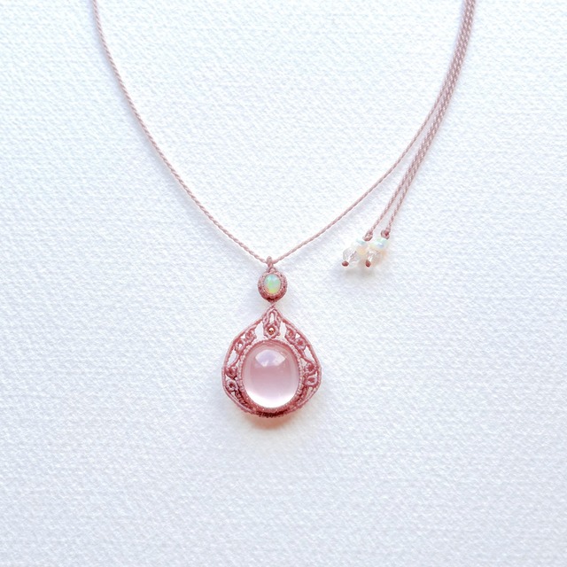 つけた時にバランスよく首元に綺麗におさまるように と考え2つの石を配置し、オリーブ色のコードを合わせました。