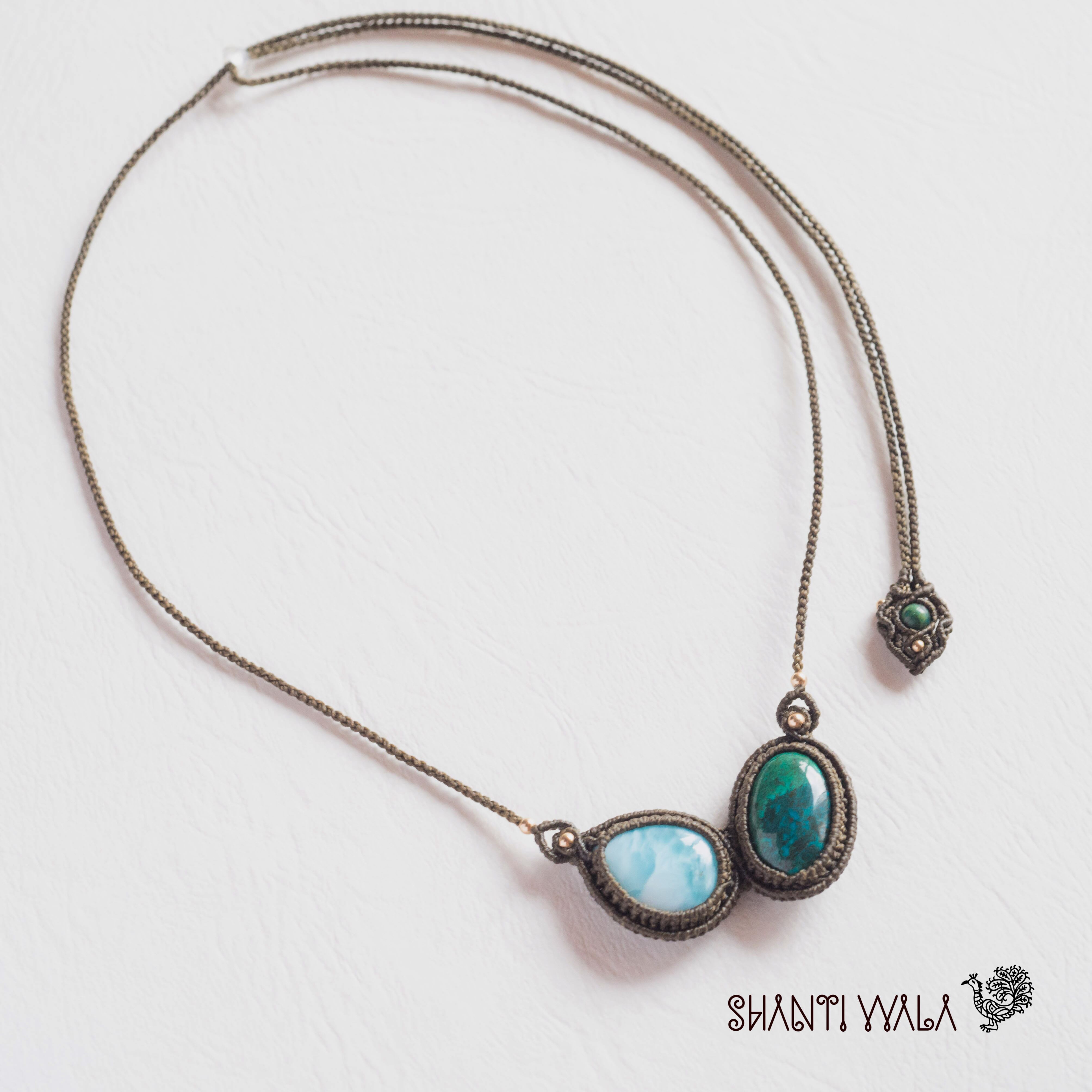 ペルー産クリソコラとドミニカ産ラリマーを使用したマクラメ編み ハンドメイドネックレスです。